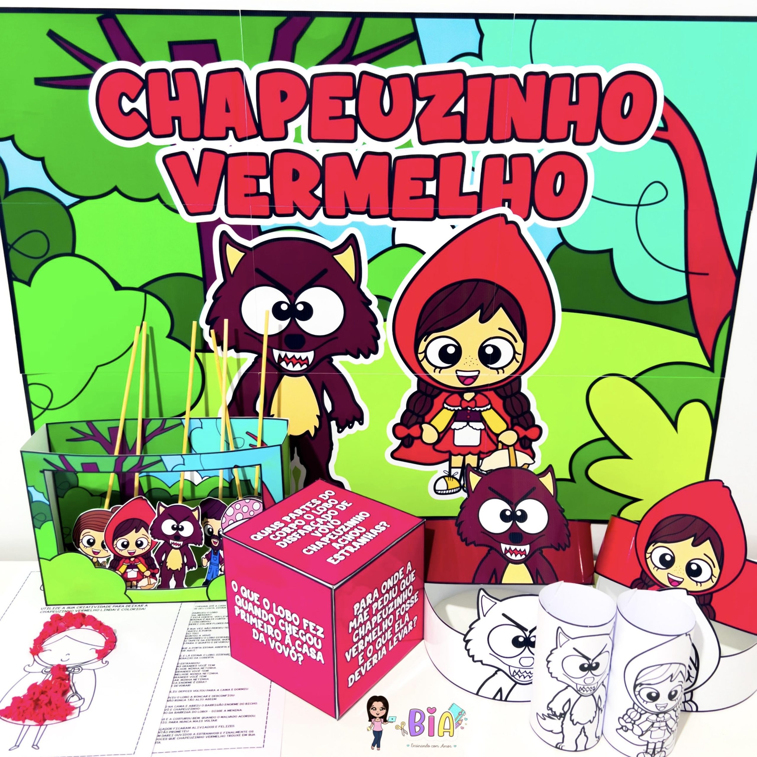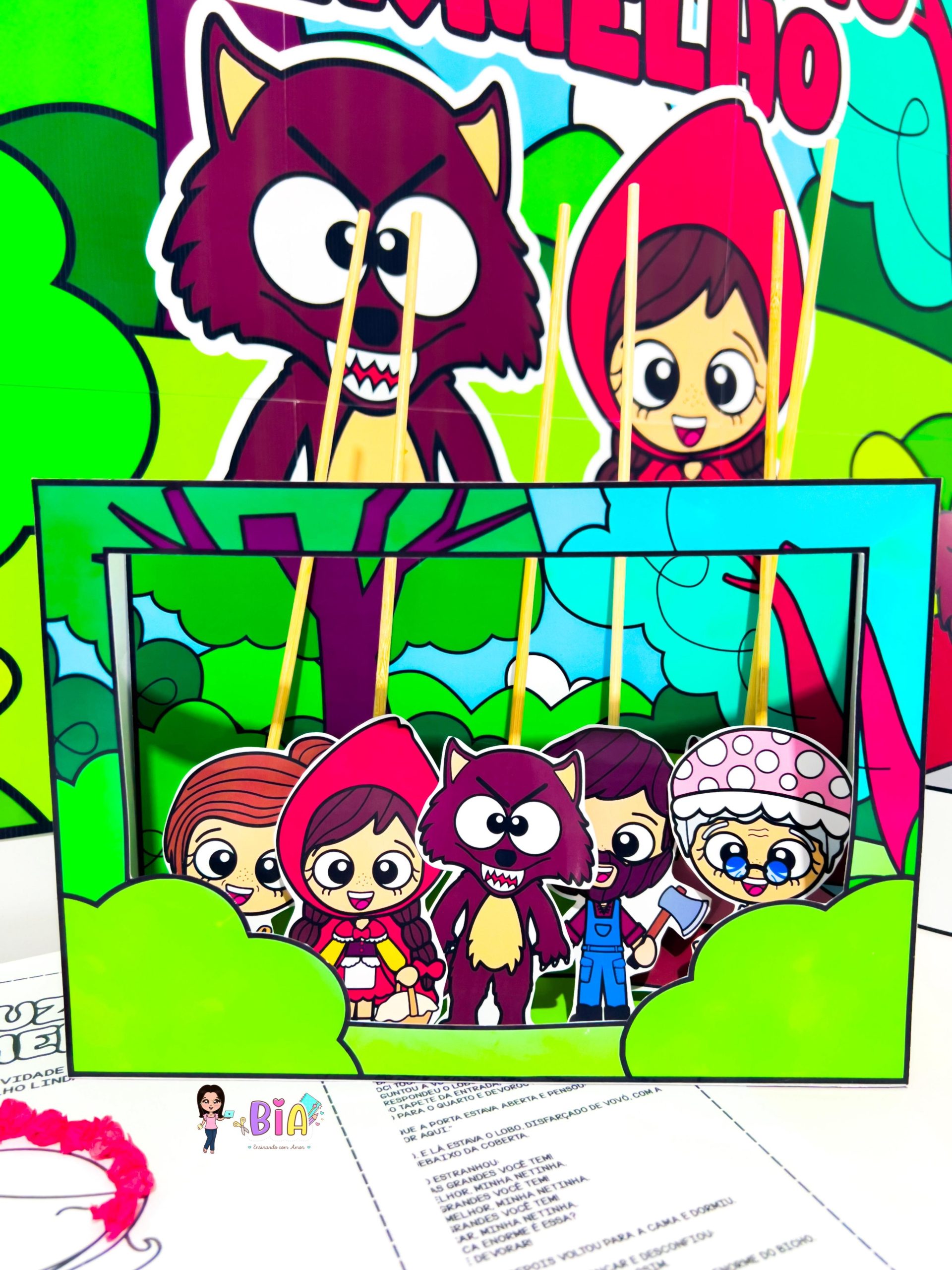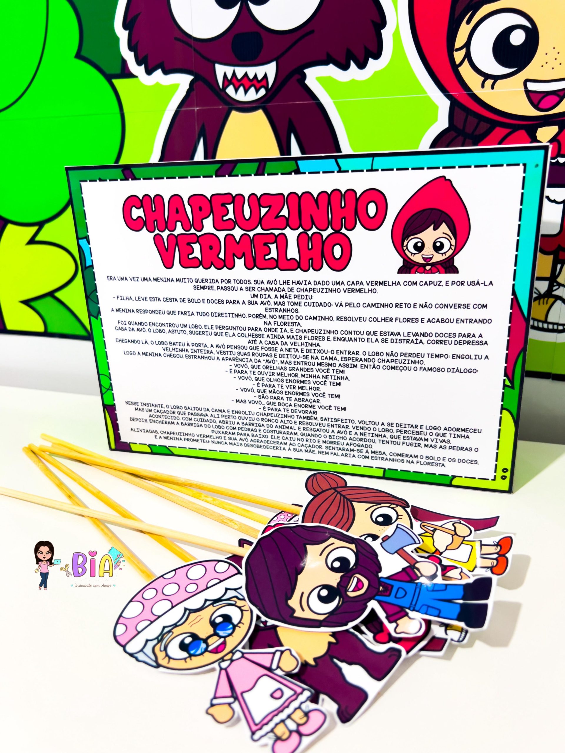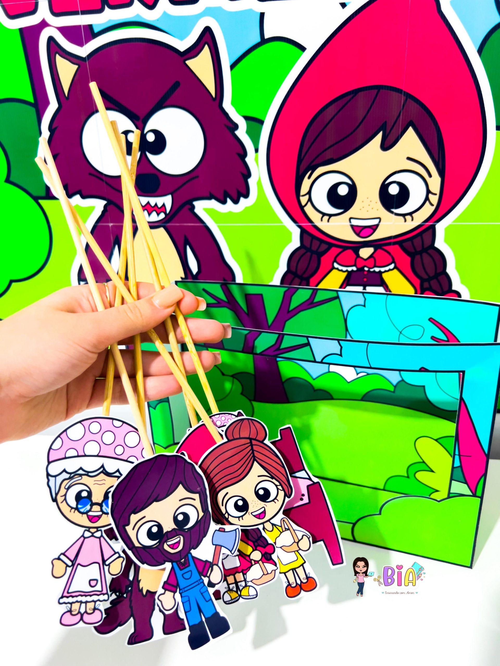 – Personagens em palito (Chapeuzinho, Lobo Mau, Vovó, Lenhador e Mamãe) para teatro de fantoches;