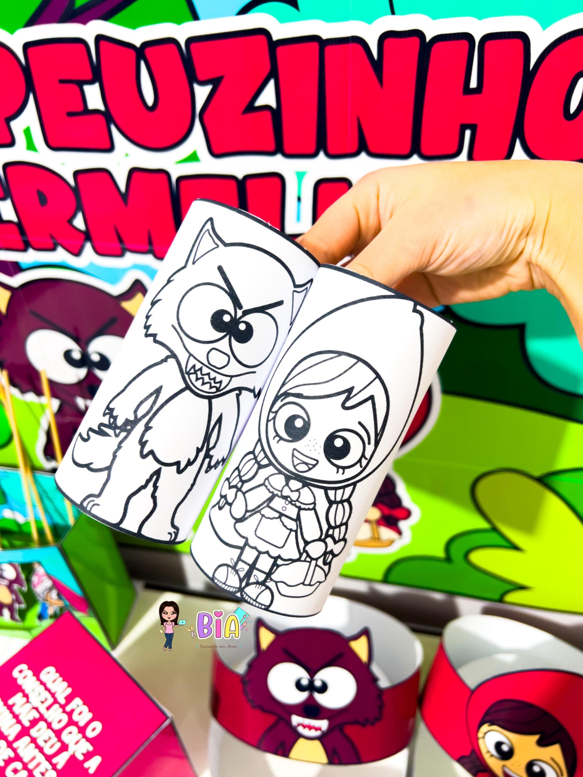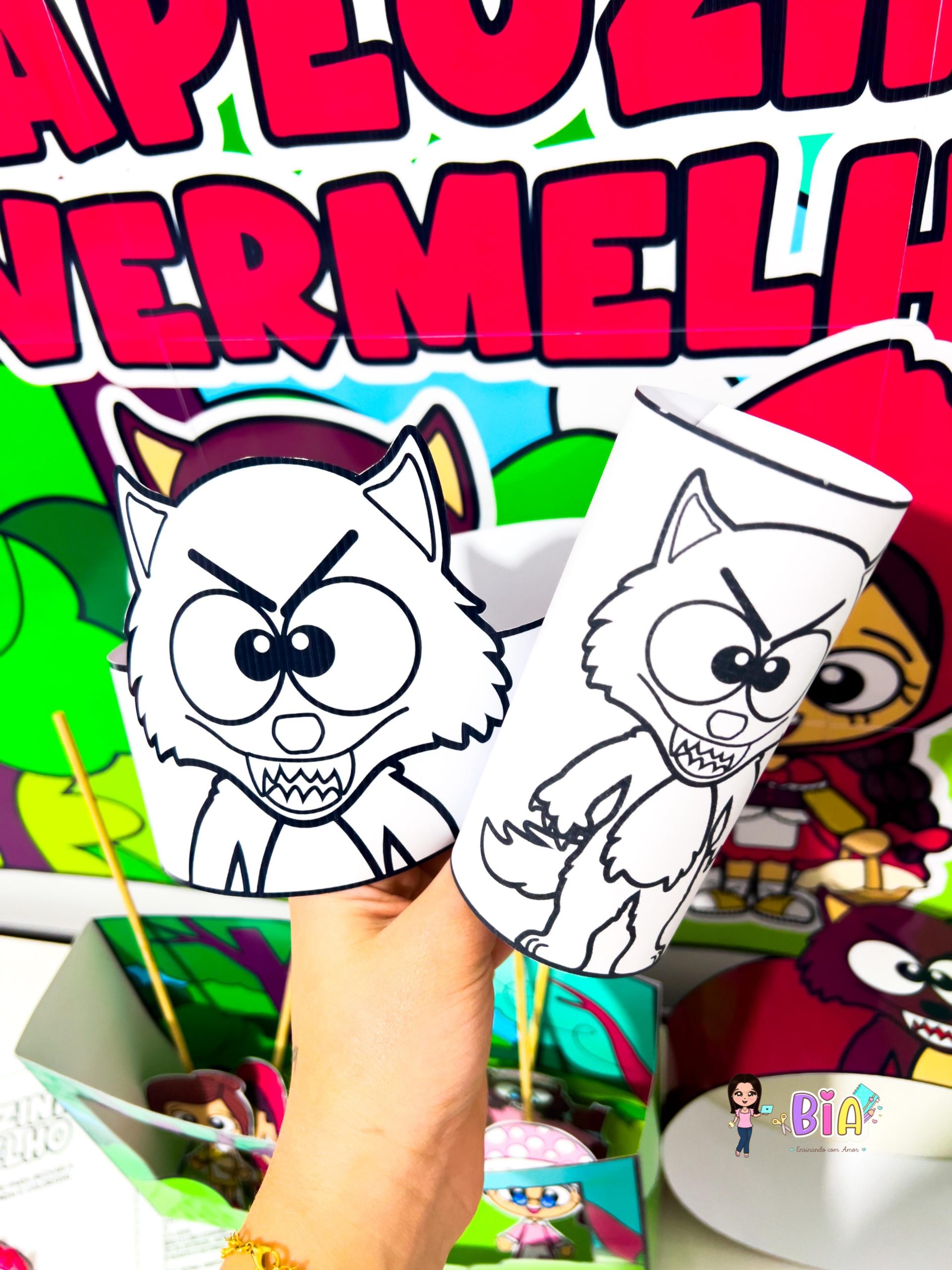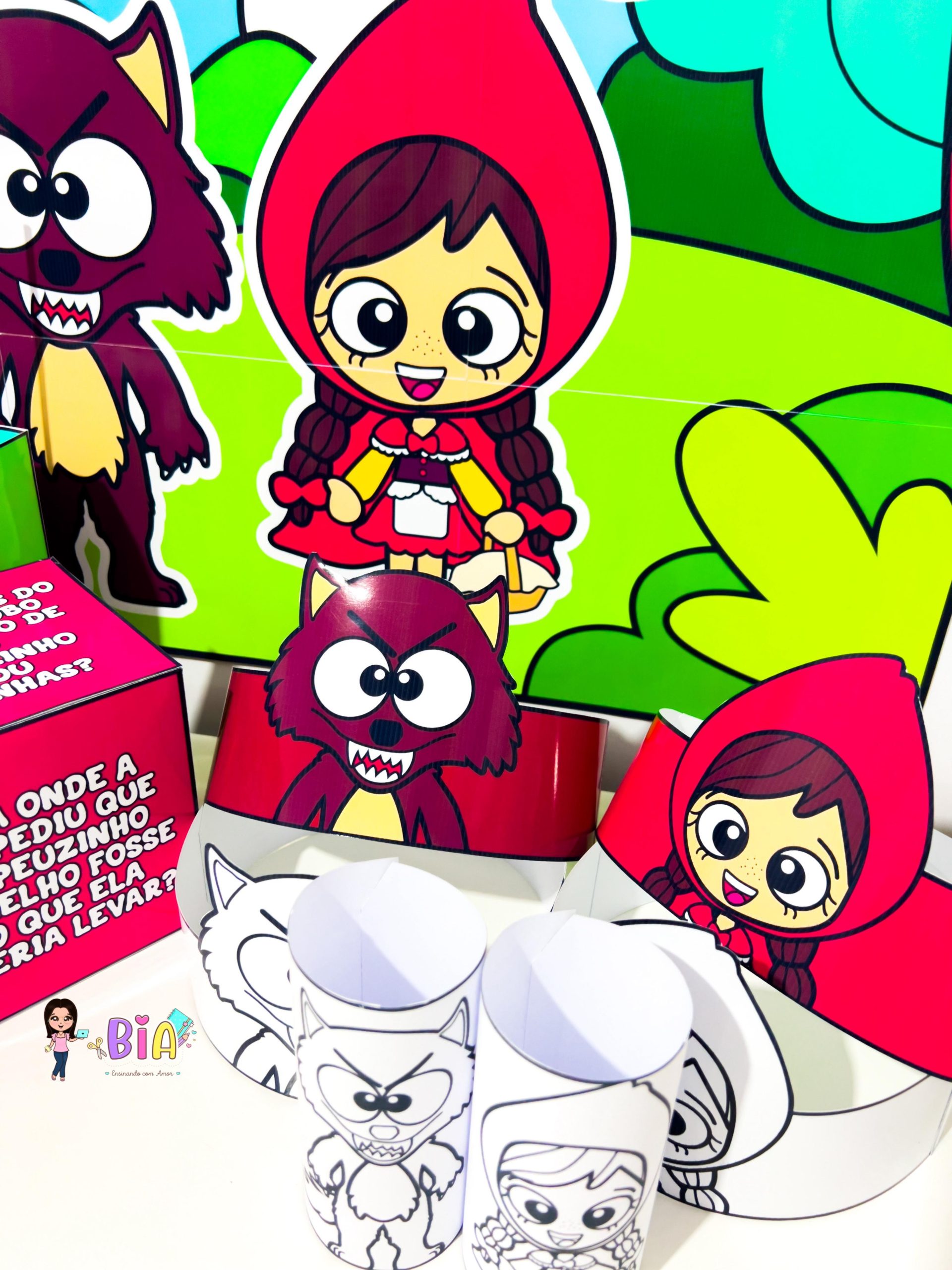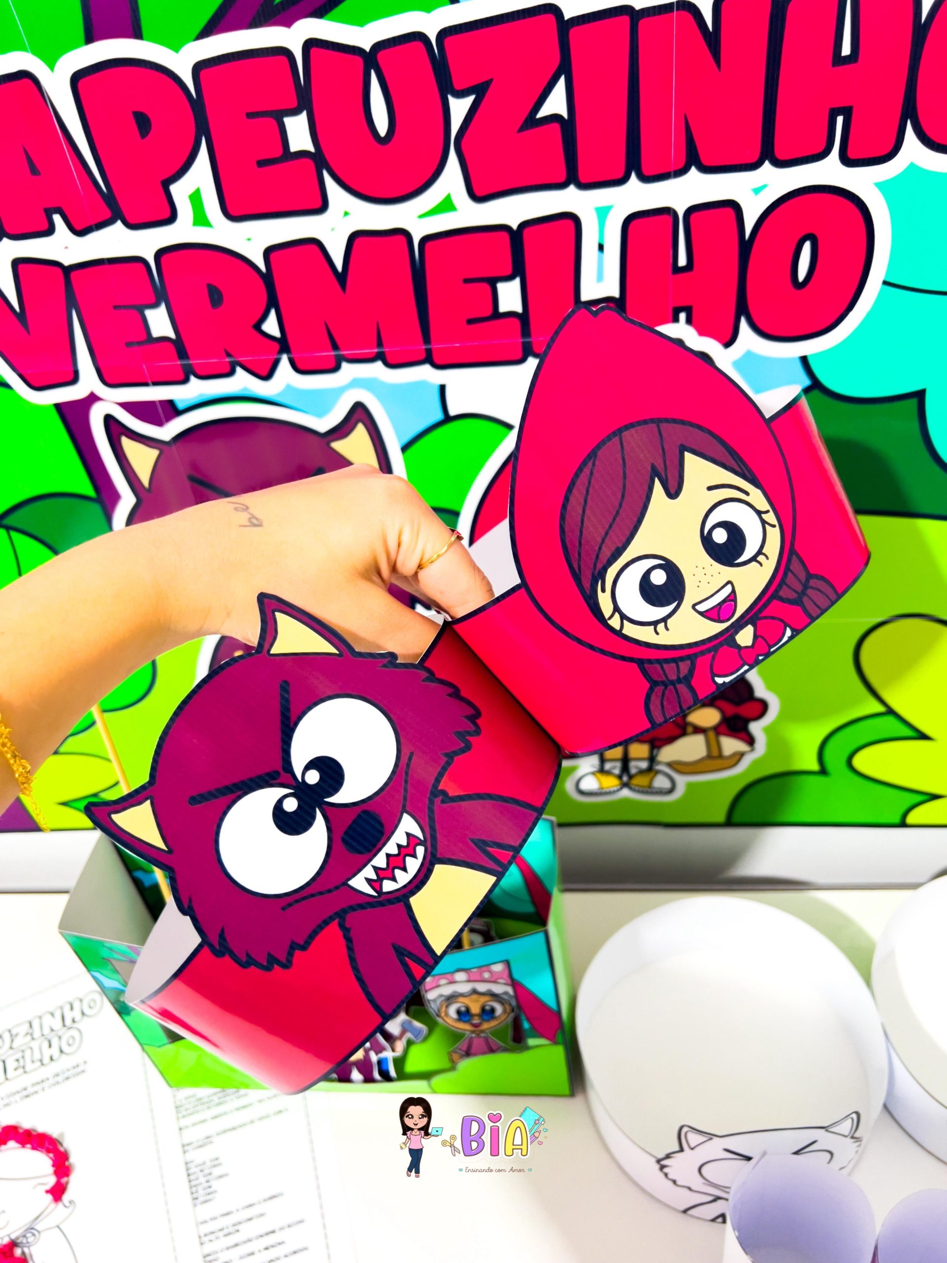 – Personagens em palito (Chapeuzinho, Lobo Mau, Vovó, Lenhador e Mamãe) para teatro de fantoches;