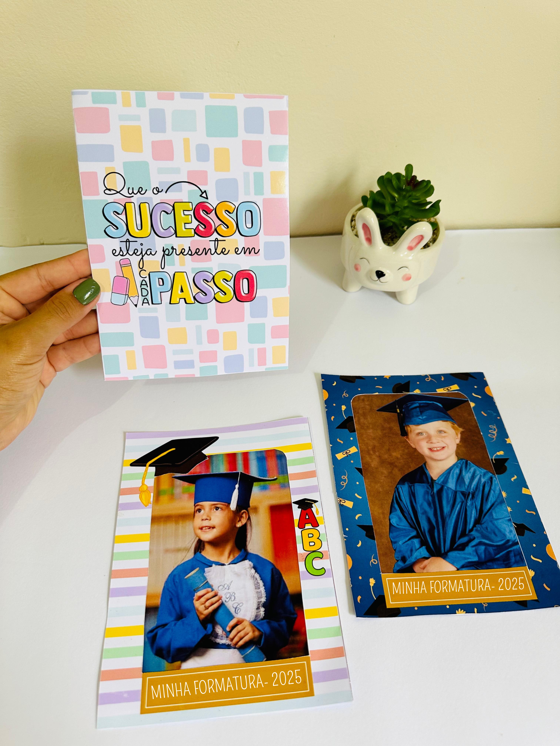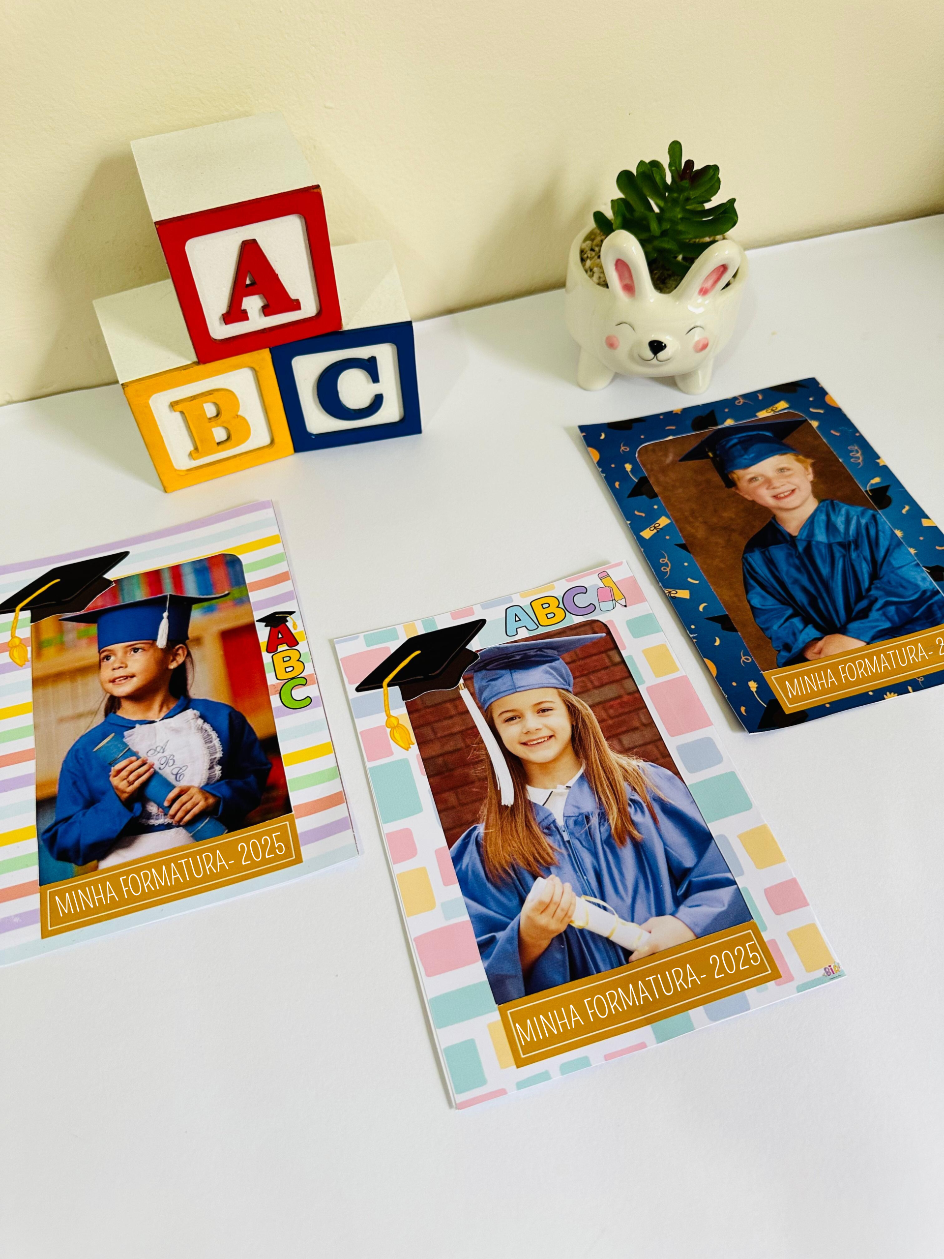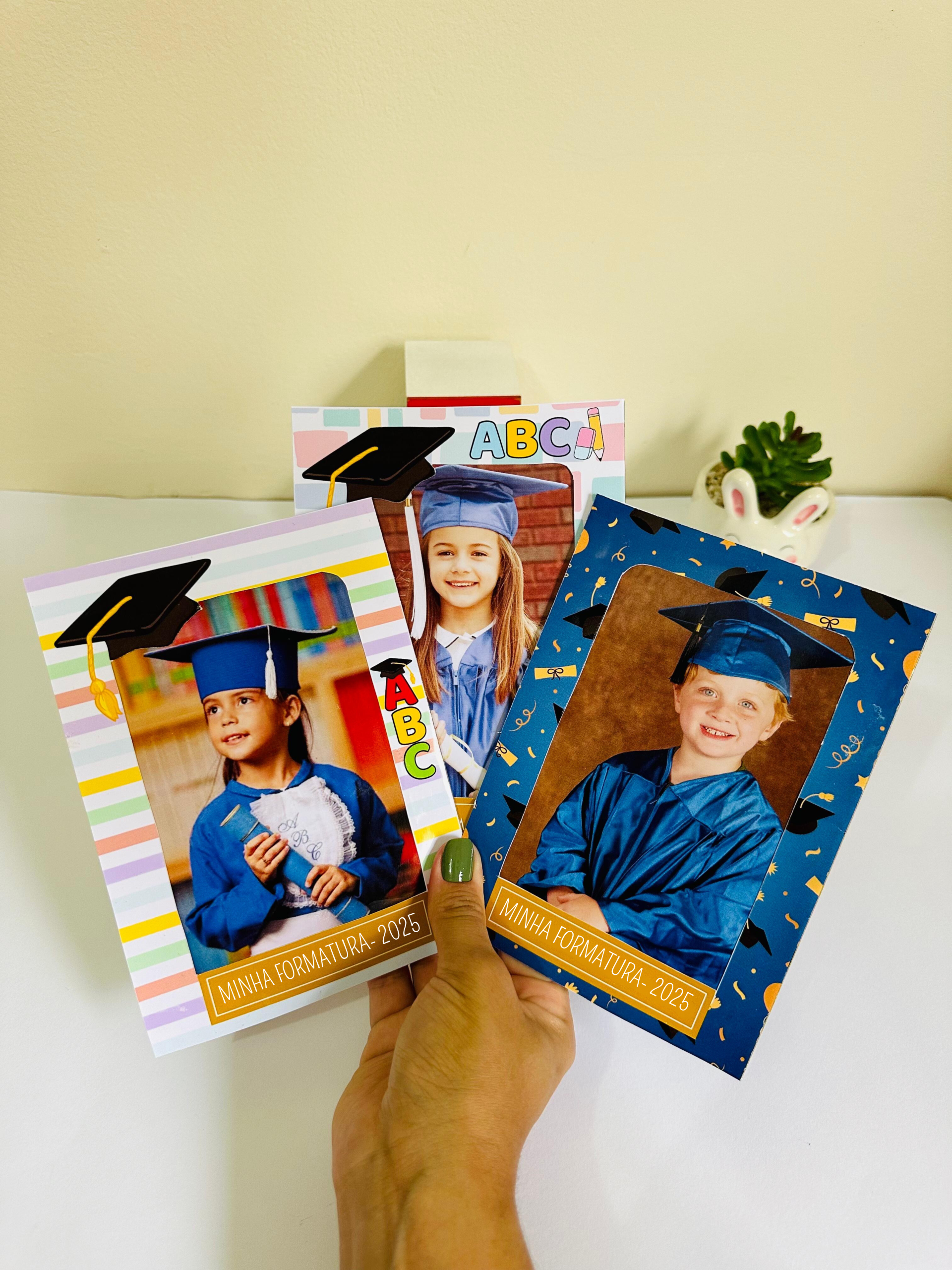 Arquivo em PDF com 3 modelos de porta retrato, prontos para apenas imprimir, recortar e colar a foto do formando 🥰